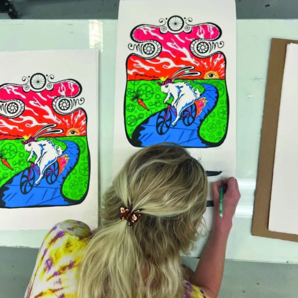 Chandler Condon’s art is a reflection of nature, a celebration of the mystical, and a glimpse into phantasmagorical worlds. She is an interdisciplinary printmaker, muralist, and designer known for her bold and playful style that combines bright colors, psychedelic shapes, and fun storylines. She reigns from Colorado, USA. Her intention with art is to call in projects around community building, conservation, music and art for all!