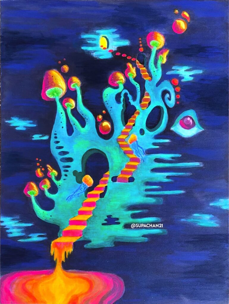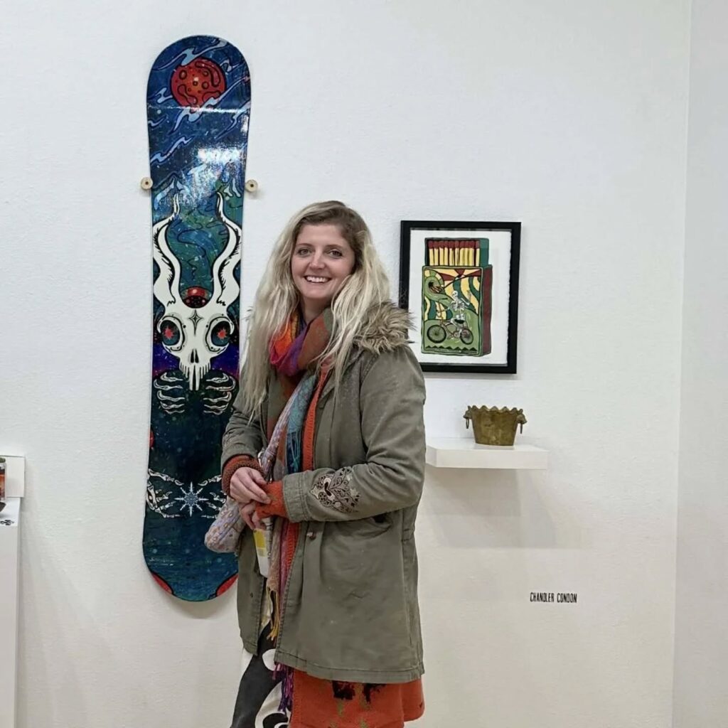 Chandler Condon(チャンドラー・コンドン)のアートは、自然の反映であり、神秘的なものへの祝祭であり、幻想的な世界への一瞥でもあります。彼女はコロラド州出身の学際的な版画家、壁画家、デザイナーであり、鮮やかな色彩、サイケデリックな形、そして楽しいストーリーを組み合わせた、大胆で遊び心のあるスタイルで知られています。彼女のアートに込められた意図は、コミュニティづくり、自然保護、音楽、そしてすべての人のためのアートに関わるプロジェクトを呼び込むことです。