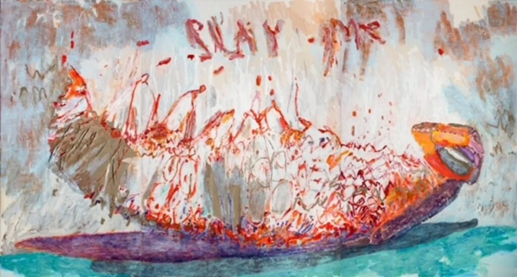 The bug depicted here lies on its back, a posture symbolic of vulnerability, mirroring the moment from Kafka’s novel. In its carnal state of surreal bodily awareness, the bug revels in pleasure and playfulness. The swollen udders on the bug, suggesting male arousal and explosive fertility, resonate with the creative process.