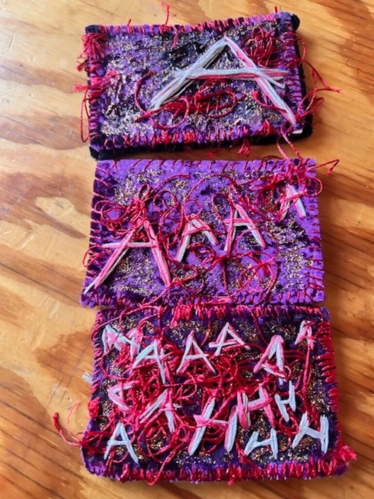 Ollie Linden is a multidisciplinary artist frequently bouncing all around the US-especially California and Oregon. Their artistic journey began with zines and comics, which they gravitated to as a means of sharing feelings around anxiety and mental health. They’ve gradually become interested in more tactile art mediums, and have started incorporating bookmaking, painting and embroidery into their process. Their work helps them figure out the world and they want it to be an invitation to come talk about the big feelings involved in being a person in this world.