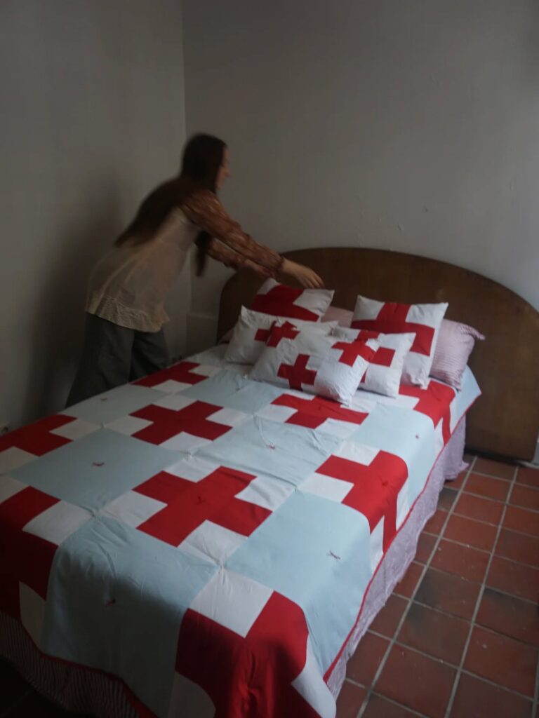 Limo(リモ)は、オランダ南部・サウスリンブルフの田園地域に暮らすアーティスト兼クラフターです。彼女の実践は、儀式的で歴史的背景に根ざしたテキスタイルクラフトを中心に展開しています。主な素材はシルク。受け継がれてきた布や素材を集め、自然染色やパッチワークを行うことが、作品づくりの基盤となっています。