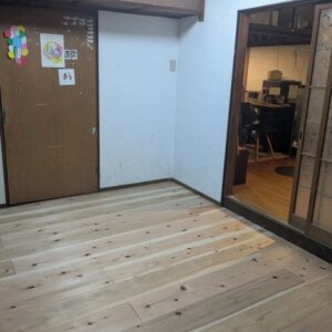 今日の松崎工業はハウス2のキッチンの床張り。古くなった床がブワブワになってきて抜けそうだったので太い杉板を上に重ね張りしました。良い感じに出来てもうここに住みたいです。