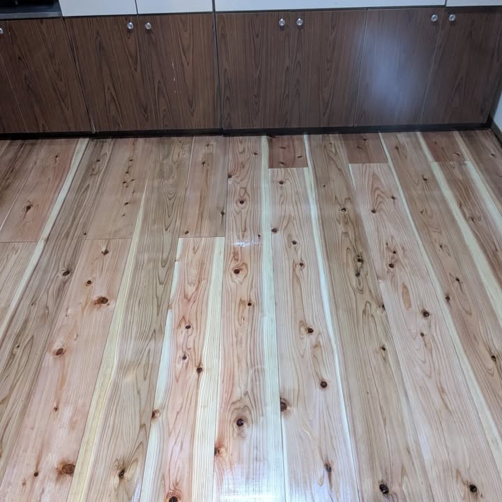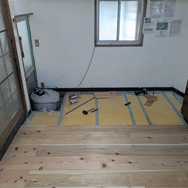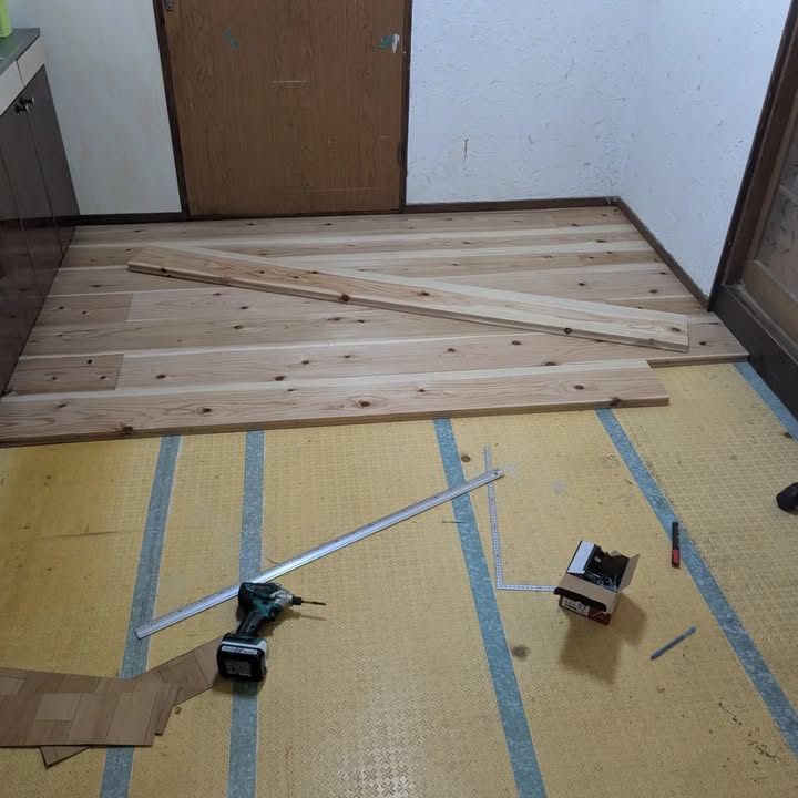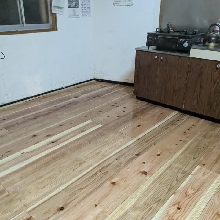 今日の松崎工業はハウス2のキッチンの床張り。古くなった床がブワブワになってきて抜けそうだったので太い杉板を上に重ね張りしました。良い感じに出来てもうここに住みたいです。