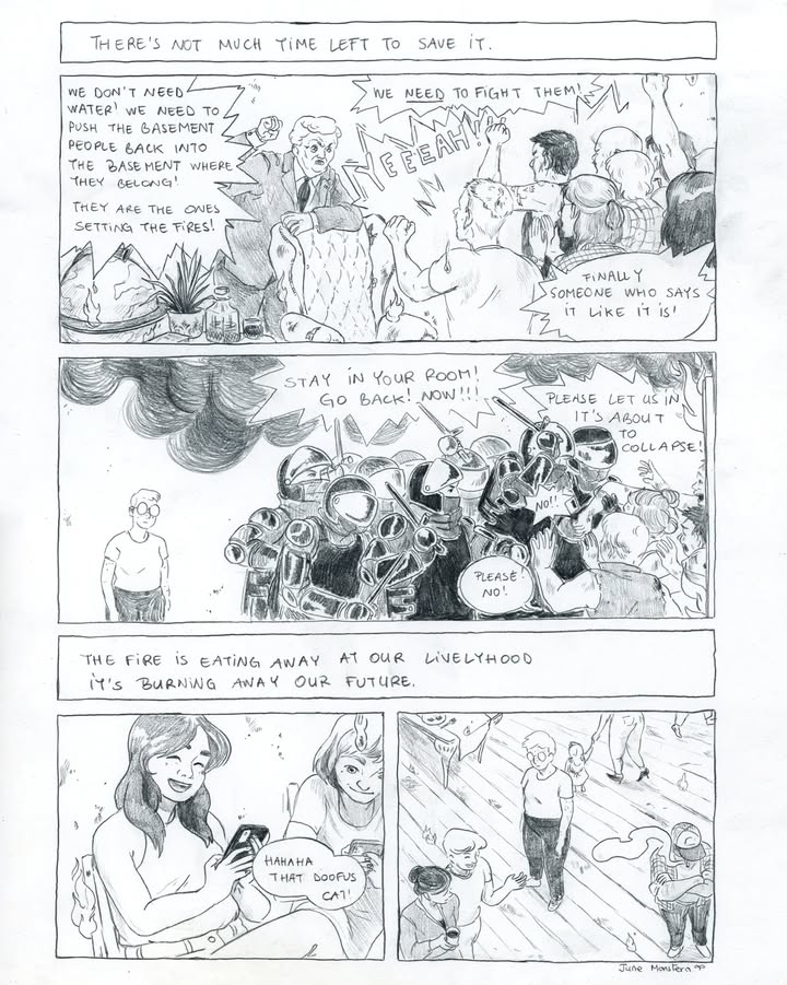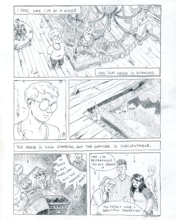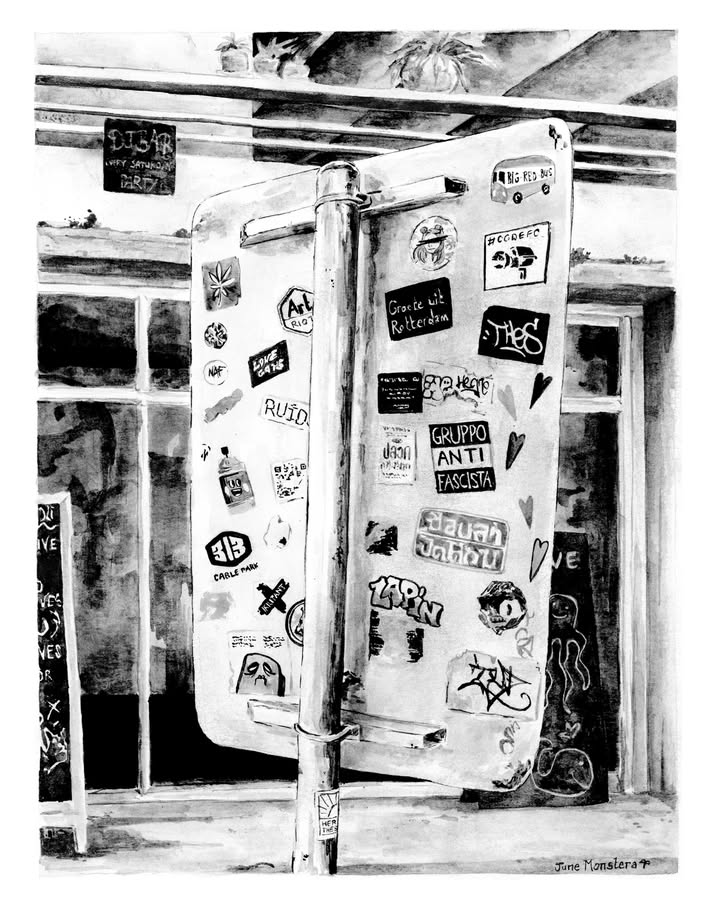 June Monstera (she/they) is an illustrator and artist based in Belgium. Her work grows from close observation of places, people, and the quiet moments that often go unnoticed. Approaching the world as a silent witness, she captures tender scenes, subtle expressions, empty spaces, and soft interactions that hold emotional weight. Through illustration, painting, and small comic strips, she shares fragments of her life while exploring themes of queerness, body positivity, everyday rituals, and human connection. Her work is drawn to melancholic beauty and the small moments where care, longing, and joy quietly coexist.
