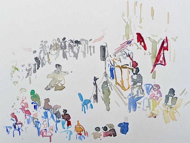 In my studio, I work with ink, watercolors, and oil paints.